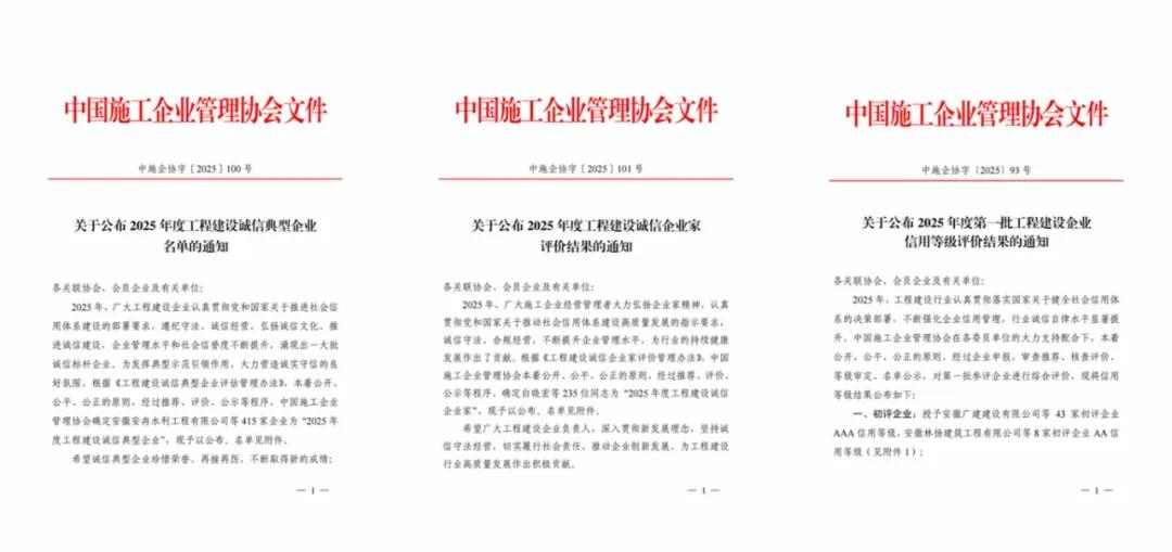 近日,中国施工企业管理协会陆续发布2025年度工程建设诚信典型企业名单、工程建设企业信用等级评价结果、工程建设诚信企业家评价结果,中青建安集团荣膺工程建设诚信典型企业,并通过AAA信用等级复评,中青建安建设集团董事长获...