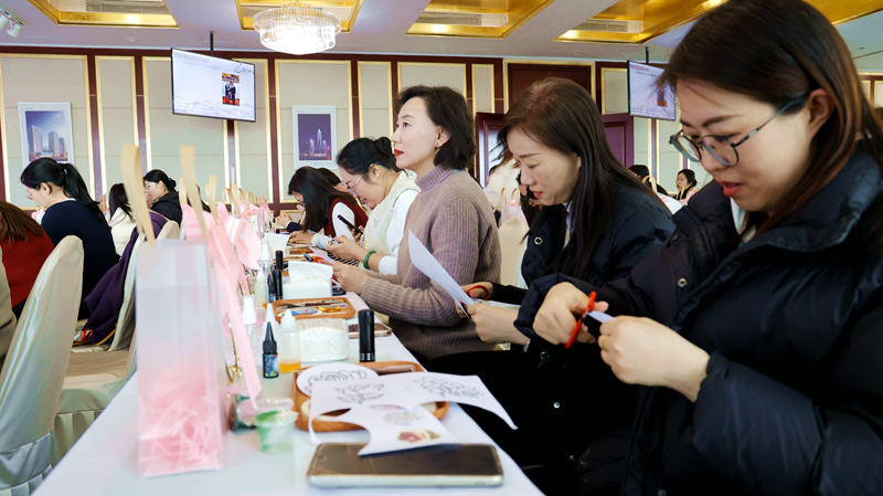 在老师的耐心指导下,女职工们开始动手制作掐丝珐琅作品。大家拿起工具和材料,按照设计好的图案,小心翼翼地掐出丝丝缕缕的轮廓,再点上五彩斑斓的珐琅彩砂。